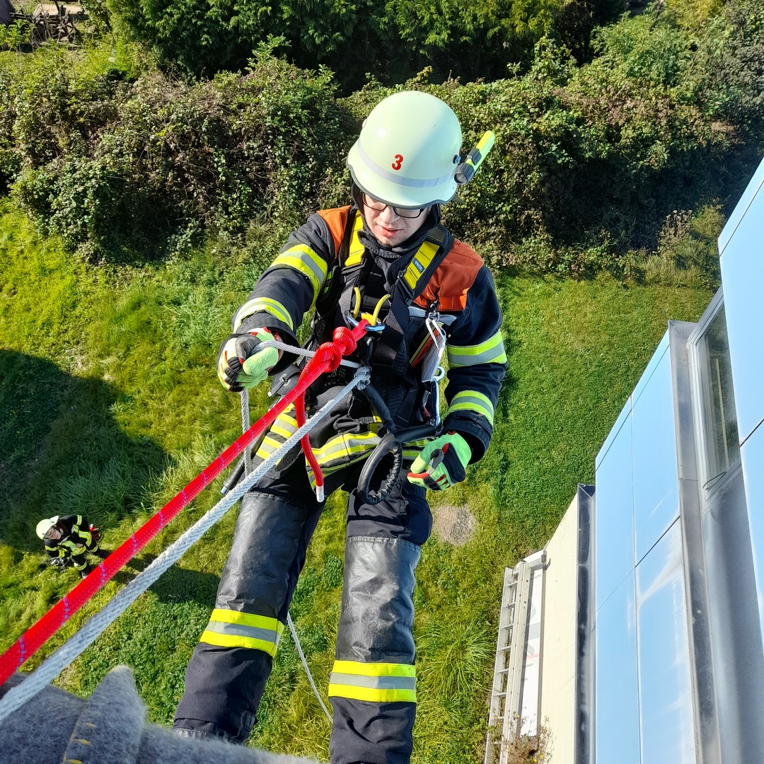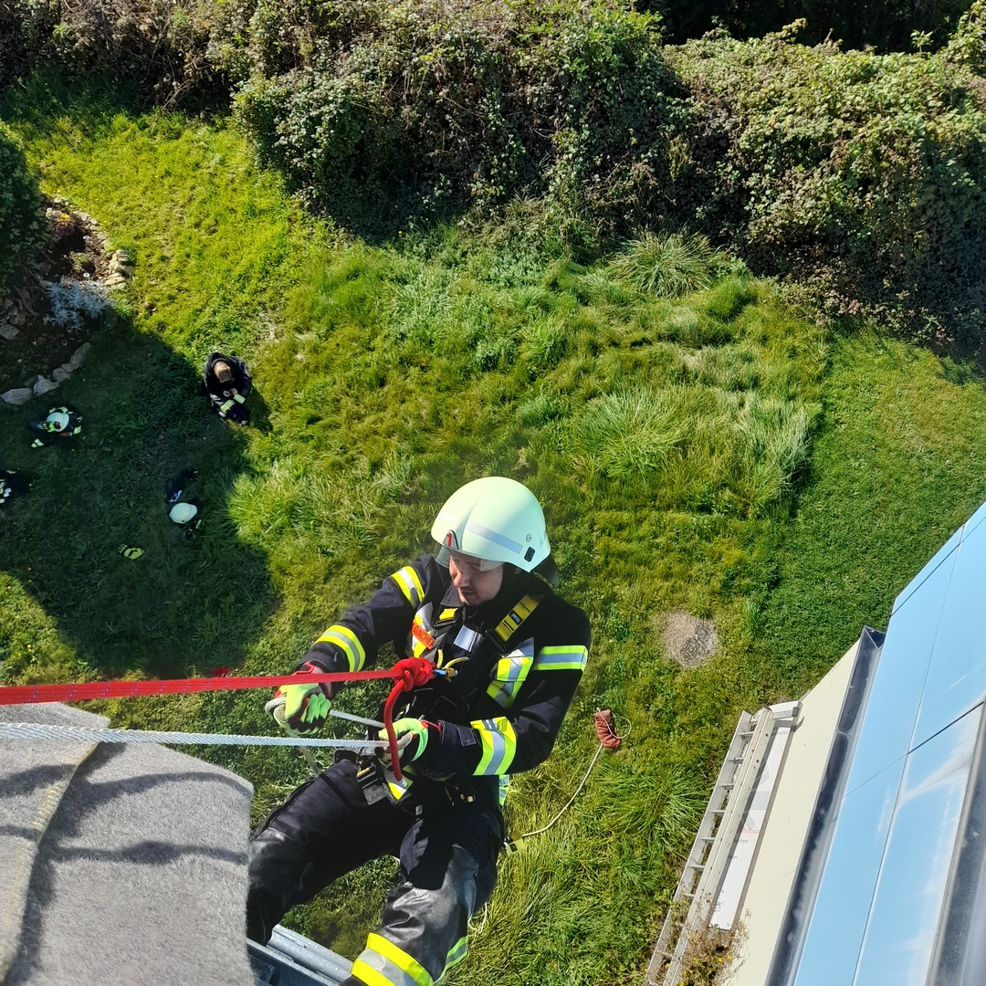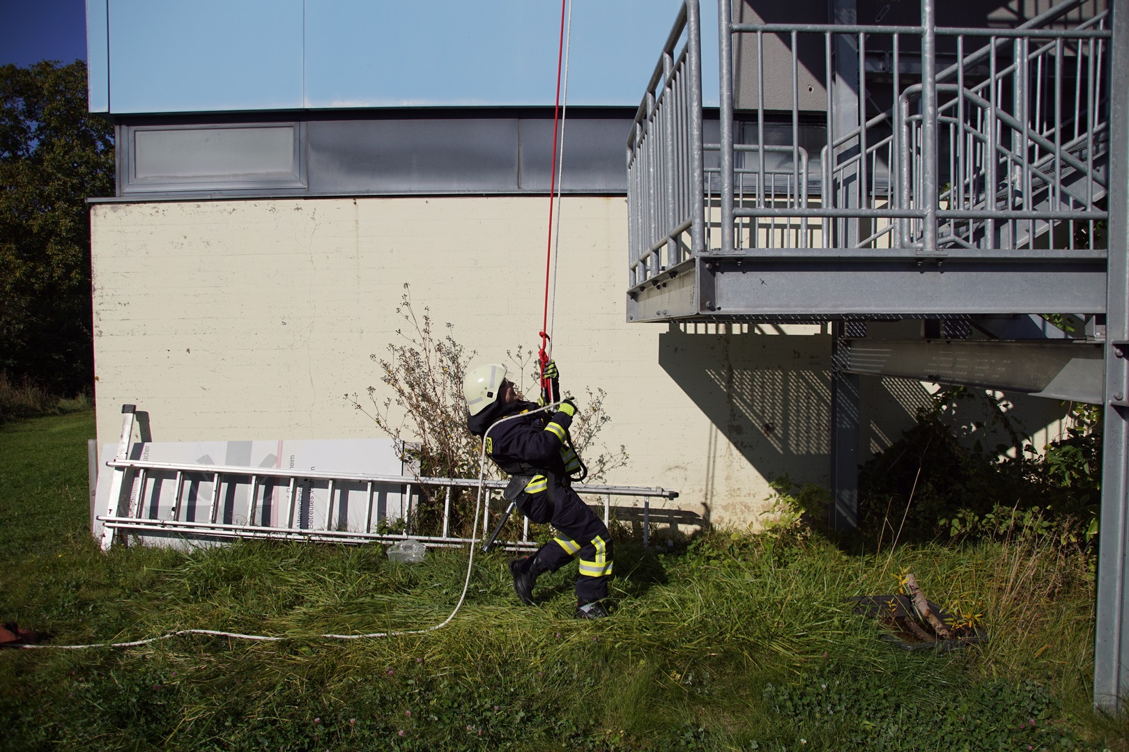Besonders gut gefiel den Teilnehmenden die Absturzsicherung, bei welcher sie sich nacheinander an einem Gebäudekomplex der St. Barbarerhöhe abseilen durften, um auch das Selbstretten in kritischen Lagen zu üben. An dieser Stelle wurde auch das Sichern von einer Person in einer Trage geübt, um diese aus beispielsweise Schächten, Höhen oder ähnlichem retten zu können.