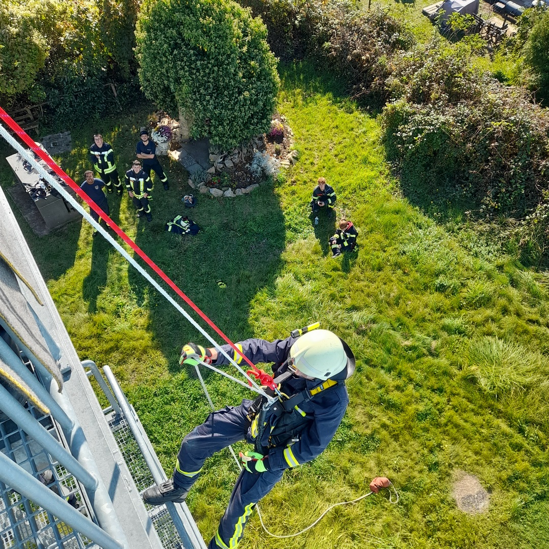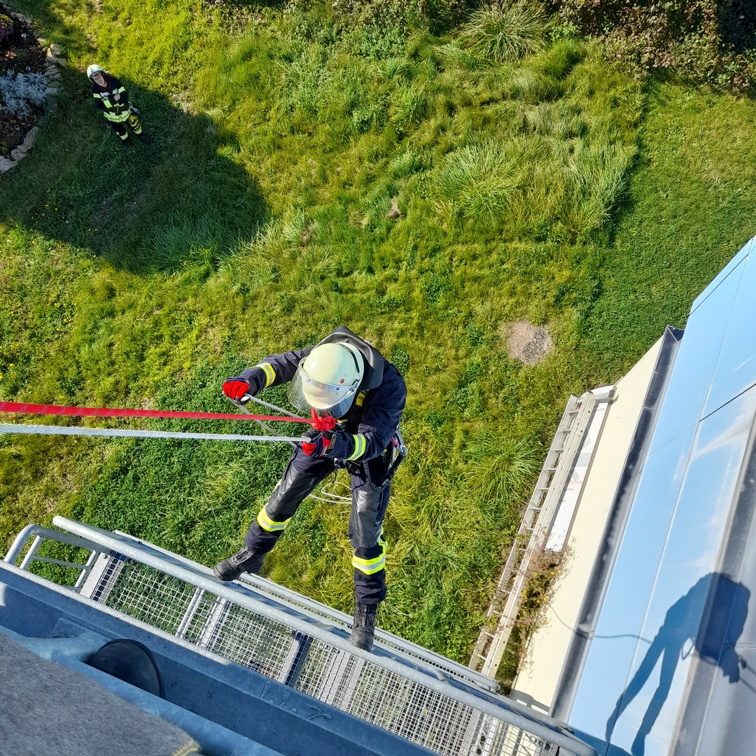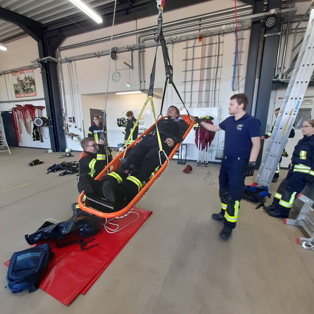 Besonders gut gefiel den Teilnehmenden die Absturzsicherung, bei welcher sie sich nacheinander an einem Gebäudekomplex der St. Barbarerhöhe abseilen durften, um auch das Selbstretten in kritischen Lagen zu üben. An dieser Stelle wurde auch das Sichern von einer Person in einer Trage geübt, um diese aus beispielsweise Schächten, Höhen oder ähnlichem retten zu können.