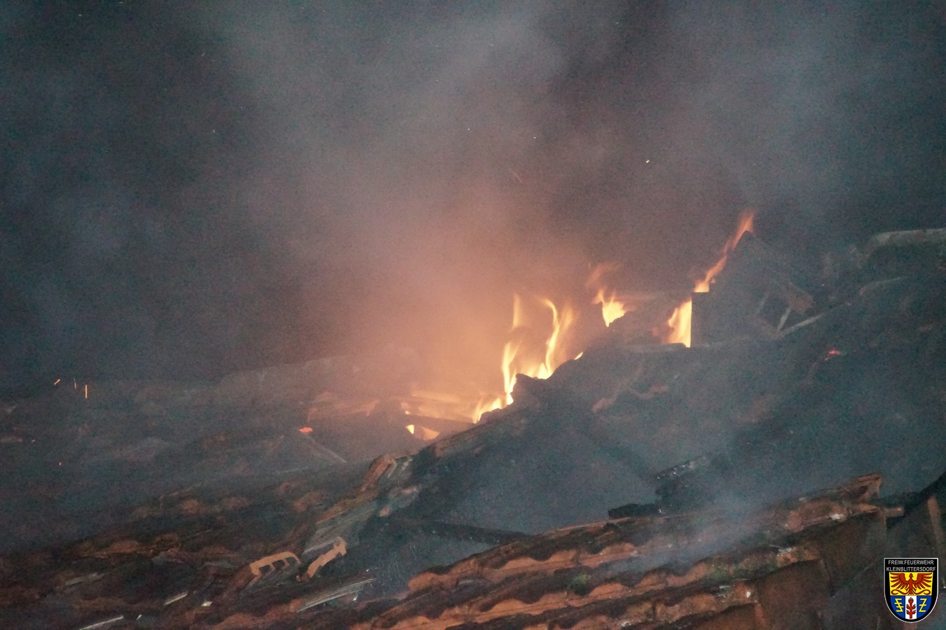 Der Brand war kurz vor 6 Uhr gelöscht („Feuer aus!“). Der Hauptbrand war schon wesentlich früher gelöscht, jedoch befanden sich noch Glutnester vor allem in der Dachkonstruktion. Um diese aufzuspüren wurde auch eine Wärmebildkamera eingesetzt. Erst wenn mit ziemlicher Sicherheit alle Glutnester abgelöscht sind kommt das Kommando „Feuer aus“. Dann beginnen die Aufräum- und Rückbauarbeiten. Auch müssen die Fahrzeuge wieder, vor allem mit Atemschutzgeräten, bestückt und einsatzbereit gemacht werden.